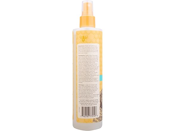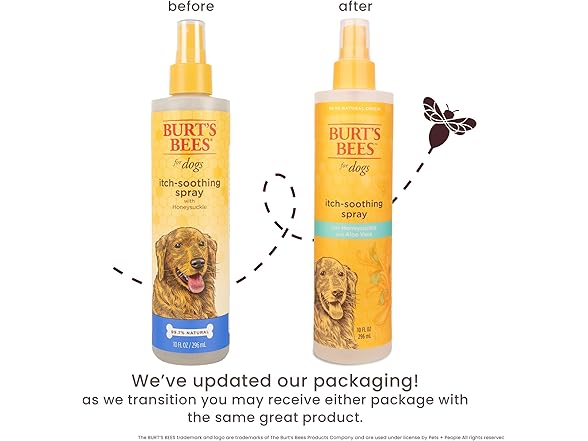 Since 1984, Burt’s Bees has been working with nature to create products that nourish your skin. With the same mission in mind, we created a custom formulated range of dog grooming formulas to bring the same quality to the lives of our pets. Burt’s Bees™ for Pets™ Itch Soothing Dog Spray soothes itching while it nourishes and moisturizes their skin and coat. Leveraging the power of naturally derived ingredients, honeysuckle soothes itchy dog skin while honey acts as a conditioner and regulates the delicate pH unique to pets, delivering a high shine finish. All our dog grooming products utilize 95%+ natural origin formulas and are formulated without chemical detergents, phthalates, parabens, or sulfates. Our dog grooming products are also formulated without added colorants and dyes. Burt’s Bees naturally derived pet grooming solutions keep pets clean and pet parents happy! Our honeysuckle dog spray is cruelty-free and made in the USA with global ingredients, using 80% post-consumer recycled bottles and responsible sourcing. Directions: Spray your dog from back of ears to tail and let dry. For face and ears, apply first to a towel then wipe on fur and avoid eyes. Repeat as needed. *Nielsen Total Pet Plus Stores Pet Grooming Shampoo/Conditioner L52 W/E 10-11-25