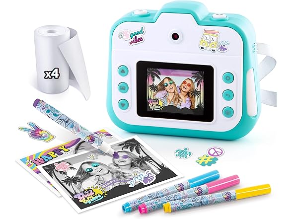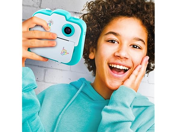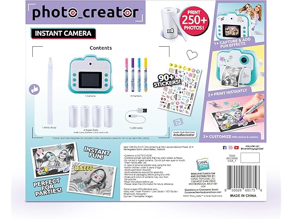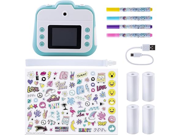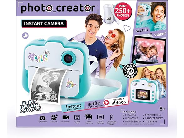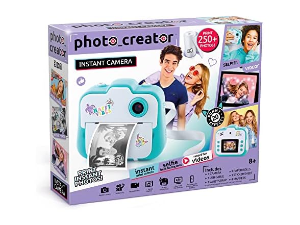 Capture photos and instantly print them with the Photo_Creator! This easy-to-use camera includes three different functions in one device – a digital camera, instant printer, and a video camera! Use the back or front facing lenses to capture photos or selfies. Switch to the video function to have fun recording videos with your friends. You can even choose between 20+ funny effects to add onto your photos. The thermal printing capability means no ink and no film! You’ll always be ready to capture and print a fun memory. Personalize your photos with markers and trendy stickers to hang on your wall or locker. The compact design, wrist strap, printer, and funny effects make the Photo_Creator perfect for parties, travel, and any other occasion! Instant photos and instant fun! Print over 250 black and white photos and save full color digital versions on your computer with the included USB cable. Includes one camera, one wrist strap, one USB cable, 4 paper rolls, 4 markers, and 90+ stickers!