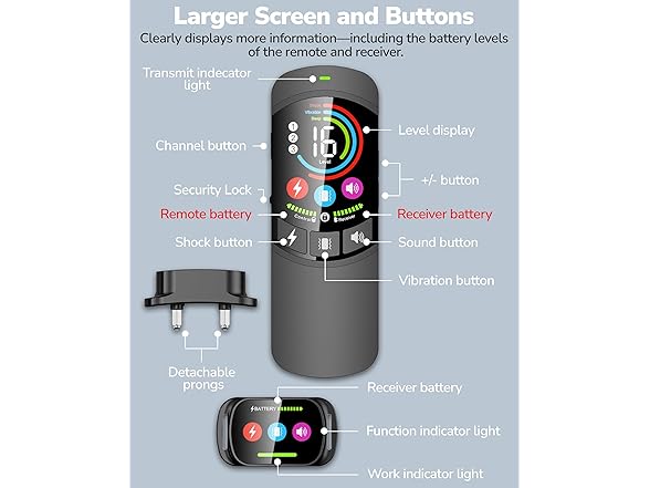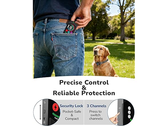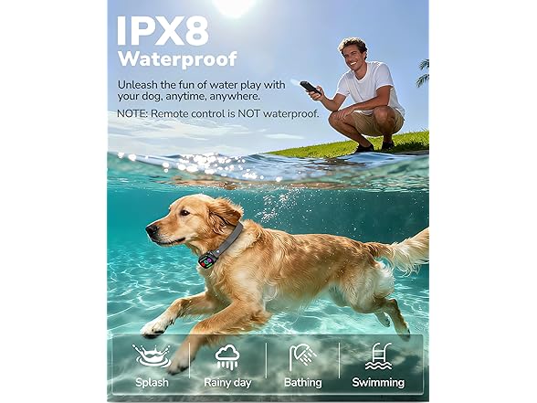 - 【IPX8 Waterproof & Safety Lock】The receiver boasts IPX8 Submersible Waterproofing for full functionality during swimming, showering and rain/snow. Our security lock prevents accidental activation of the dog training collar with remote, ensuring pet is not disturbed for no reason. (Note: Remote is NOT waterproof.)