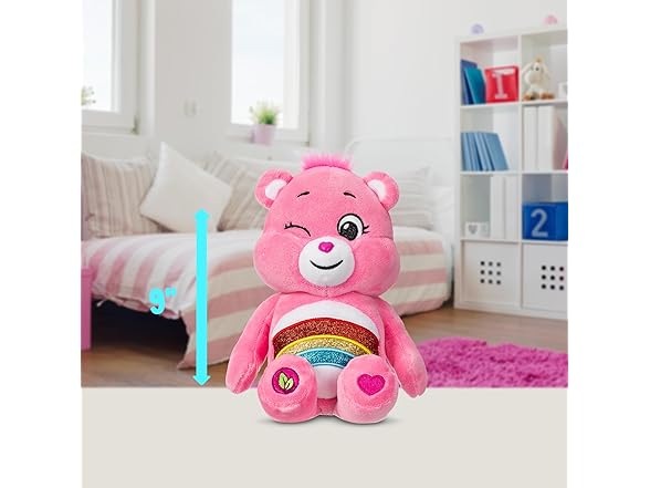 - 9” Fun-Size Plushie: Featured in a beautiful 9-inch plush design, Cheer Bear is the perfect size for taking on adventures of sharing and caring!