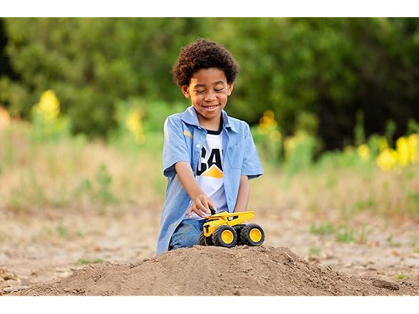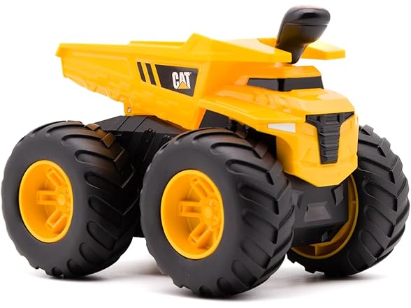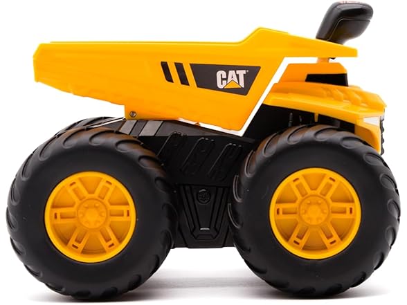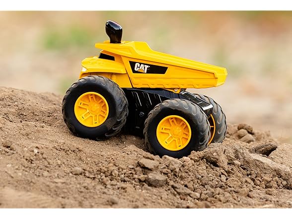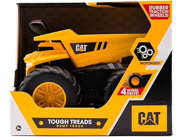 Conquer any terrain with the Cat Tough Treads Dump Truck! Equipped with large, rubberized tires designed for all-terrain action and 4-wheel drive, this 7” vehicle lets kids control the movement with ease. Push the lever forward for continuous forward movement, push the lever backwards for reverse movement, or leave the lever in the middle for neutral mode. Made from durable materials with articulating parts, the Cat Tough Treads Dump Truck is ready to haul and dump heavy loads, wherever the job takes it! Appropriate for ages 5 and up.