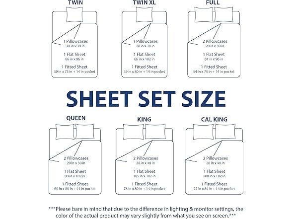 - WHAT’S INCLUDED - Cal King Set Includes: 1 Fitted Sheet 72" x 84", 1 Flat Sheet 108" x 102", 2 Pillowcases 20" x 40".