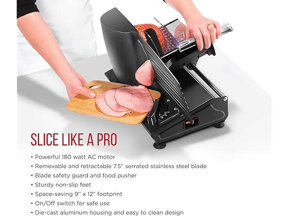 - EASY USE & CLEANUP: Powerful 180-Watt AC motor and serrated stainless-steel blade allow foods to glide through the slicer with ease. Removable and retractable 7.5" serrated stainless-steel blade and die-cast aluminum housing are easy to clean.120V