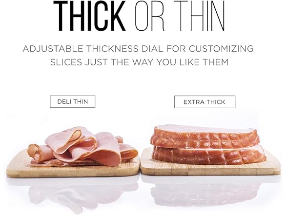 - SLICE YOUR FAVORITES: Use your food cutter to easily slice deli style ham, turkey, roast beef, dried meat, cheese, bread, fruit, and vegetables right in your own kitchen. The food slicer is equipped with an adjustable thickness dial for customizing slices just the way you like them.