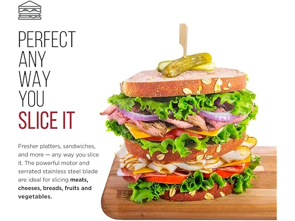 YOUR KITCHEN, YOUR SLICES, YOUR WAY. Fresher Charcuterie boards, sandwiches, and more — any way you slice it. With a powerful 180 Watt motor and serrated stainless steel blade, this machine is ideal for slicing meats, cheeses, bread, fruits, and vegetables. The adjustable thickness dial makes it great for customizing how thin or thick you want to slice it, so you can get your favorite deli style sandwiches and wraps right at home. With a sleek, compact design, this 9" x 12" food cutter is small enough for most cabinets and countertops, making it the perfect tool for any home cook. Removable and retractable 7.5" serrated stainless steel blade and die-cast aluminum housing are easy to clean. Sturdy non-slip feet, blade safety guard, and food pusher ensure that the food slicer will stay in place, so you can keep a firm grip and full confidence while operating. The safe on/off switch feature allows you to cut safely for a customized, clean slice - every time.