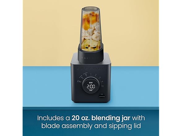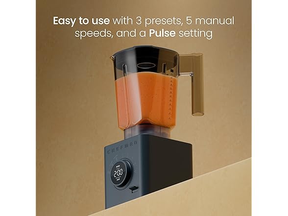- INTUITIVE CONTROLS: The dial control panel includes 5 blending speeds and a pulse option to finetune your blending. Presets include a countdown timer and LED alerts notify you when you need to “Fix Jar” or “Add Liquid.”
