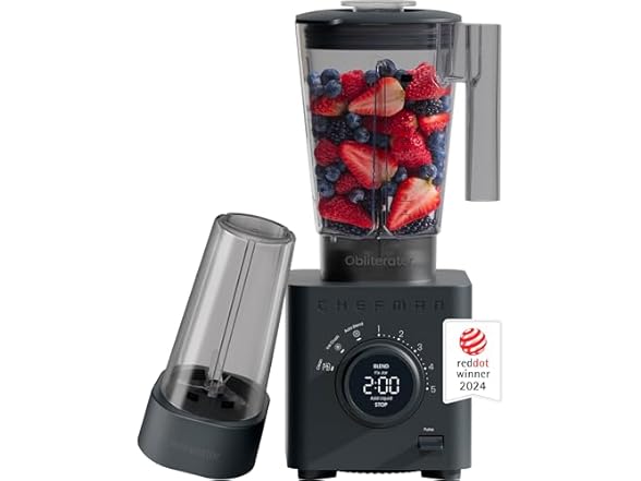 Obliterate any- and everything with the Chefman Obliterator™, a high-powered small blender that makes crushing ice look easy! With a robust 1380W motor and advanced airflow system, you can pulverize even the toughest ingredients while the blender remains cool and quiet. The new Auto Blend function identifies ingredients, automatically optimizing the blending cycle for the best results possible. The dial controls are easy to use, allowing you to choose from six blending speeds and three preset functions. The 48 oz. blending jar pours perfectly, and the stainless-steel blades hold up well to wear and tear.