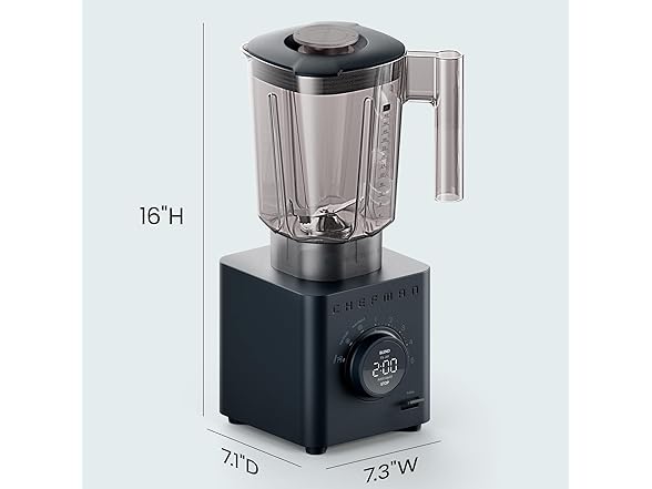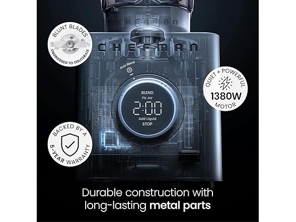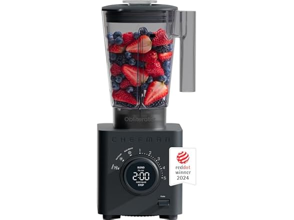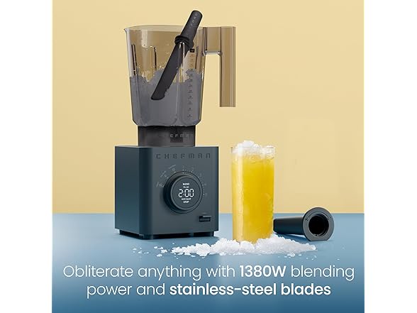 Obliterate any- and everything with the Chefman Obliterator, a high-powered small blender that makes crushing ice look easy! With a robust 1380W motor and advanced airflow system, you can pulverize even the toughest ingredients while the blender remains cool and quiet. The new Auto Blend function identifies ingredients, automatically optimizing the blending cycle for the best results possible. The dial control panel is easy to use, allowing you to choose from six blending speeds and three preset functions. The 48 oz. blending jar pours perfectly, and the stainless-steel blades hold up well to wear and tear. The kitchen blender comes in a beautiful matte-black finish and includes a tamper/scraper tool and our chef-crafted digital cookbook. Whether you’re whipping up smoothies, soups, or sauces, the Obliterator delivers unparalleled results with every blend. Purchase includes a 5-year assurance from Chefman. For information on how to use your product, scroll down for a PDF User Guide. 1380W/120V—RJ27-T1-MIDNIGHT-AM