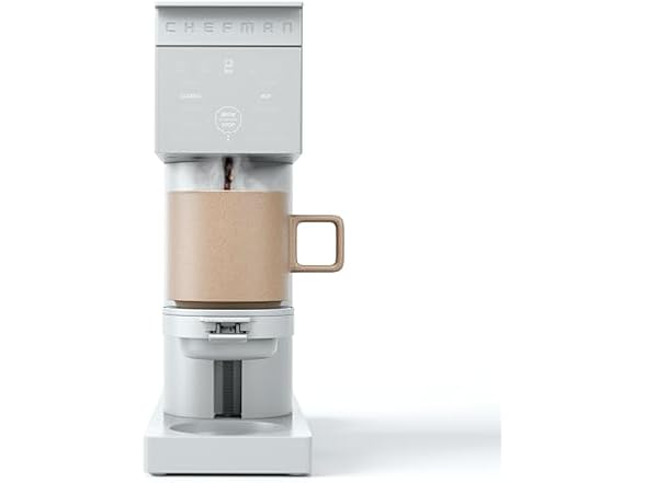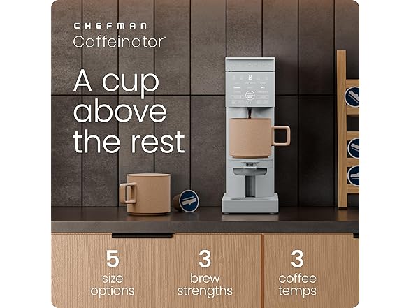 Get excited to wake up and smell the coffee with the Chefman Caffeinator, a single serve coffee machine that helps you enjoy your morning pick-me-up your way. Compatible with both coffeepods or your favorite ground coffee, you can serve up your ideal roast your way. With 5 size options (4, 6, 8, 10, and 12 ounces), 3 brew strength settings, and 3 temperatures, you can customize your drip coffee to your exact preference. Program each person’s favorite directly into the machine for a delicious one-touch brew. Choose the Over Ice option to lower brewing temperature even further, creating refreshing iced coffee without melting the ice. Adjust your mug height to ensure minimal spatter during brewing. The 48 oz. water reservoir is fully removable and comes with a charcoal filter to keep each cup tasting as fresh as the first. The user guide also comes with five barista-level beverage recipes, from making delicious mochas without an espresso machine to boozy carajillos. With a gorgeous matte-black finish and narrow design, this is a coffeemaker you’ll be proud to show off. cETL approved with advanced safety technology for long-lasting durability and a 5-year assurance provided by Chefman. 1500W/120V – C14-DB-1C-US2 • Use coffee pods or ground coffee • 5 size settings (4, 6, 8, 10, or 12 oz.) • 3 coffee strength options • 3 brew temperature settings • Over Ice setting • Touch-controlled user interface • Four programmable favorites • 48 oz. removable water reservoir • Adjustable mug lift • One charcoal water filter included