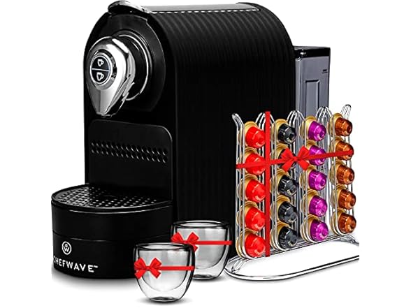(1) ChefWave Espresso Machine and Coffee Maker (Black) - Compatible with Nespresso Capsules, Programmable, One-Touch, Italian 20 Bar High-Pressure Pump Bundle with Pod Holder and Glasses
