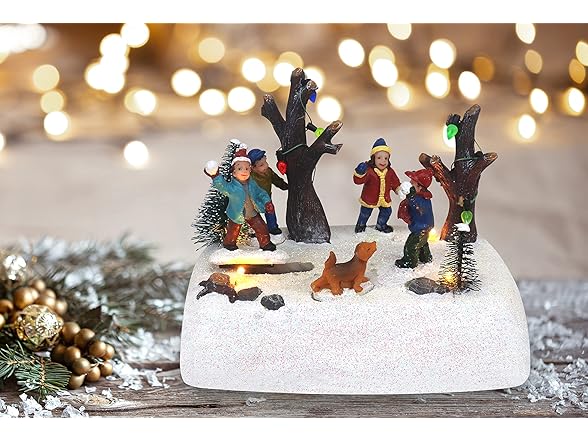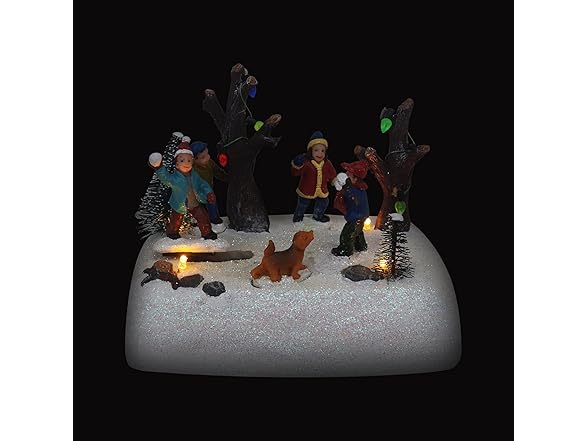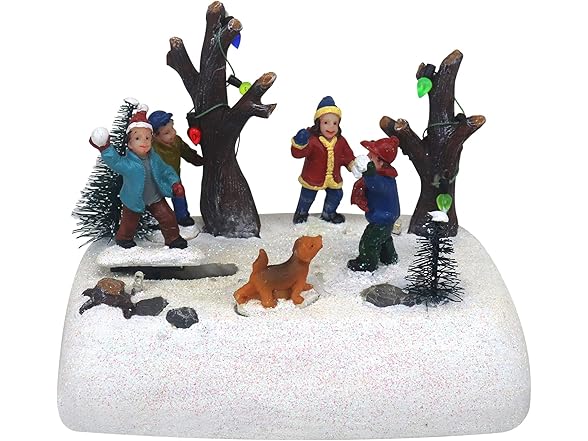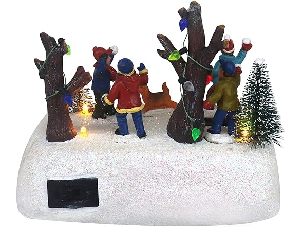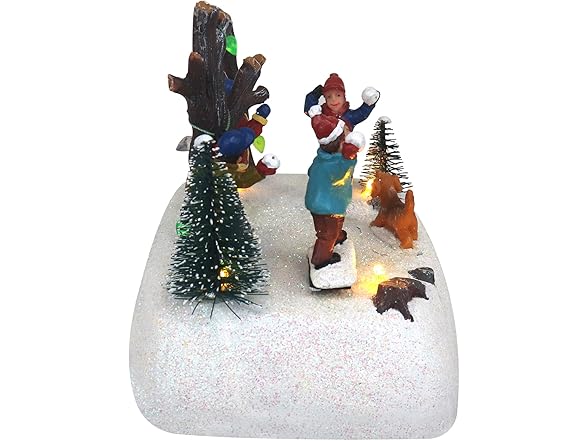 - SPECIFICATIONS – Kids playfully engage in a snowball fight, illuminated by warm LED lights that make this Christmas table centerpiece enchanting. Creating a magical moment and bringing the holiday spirit indoors. This Snow Village Display is operated by 3 AA batteries (NOT INCLUDED). You can place it anywhere you want, and design your own Christmas Village Display Indoor or Outdoor! Product size: 6.3 x 4.3 x 5.5 In.
