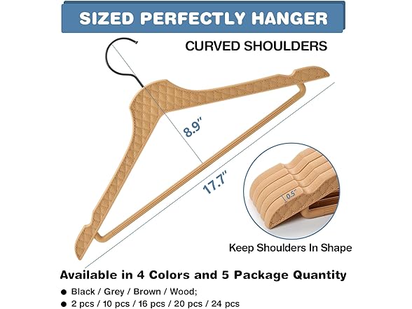 - 👚【CLOTHES HANGERS SPECIFICATION】 17.7"L x 0.4"W x8.9"H, 4 colors of black, grey, brown and wood, as well as a variety of quantity combinations for your choice. Hanger's Hook height 3.3" fits most wardrobe hanging rods