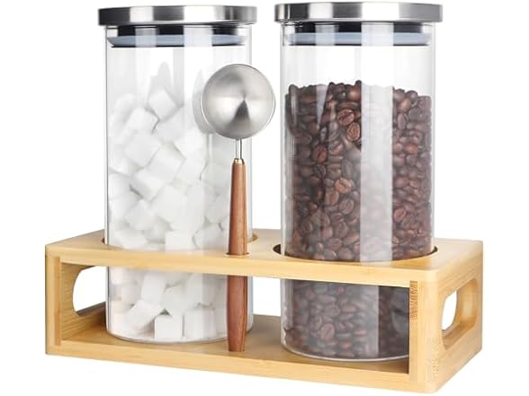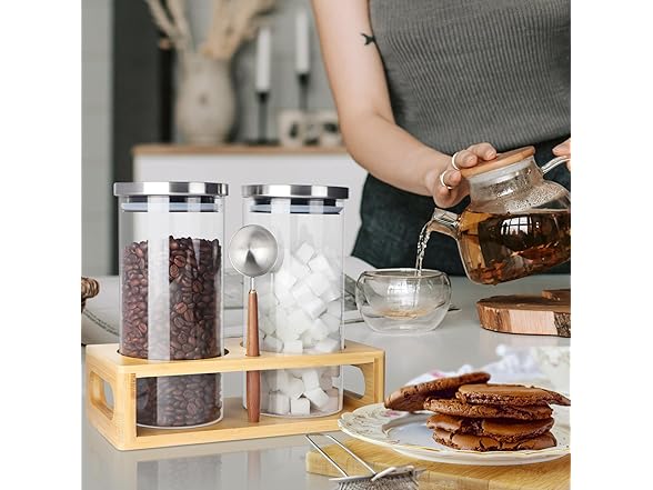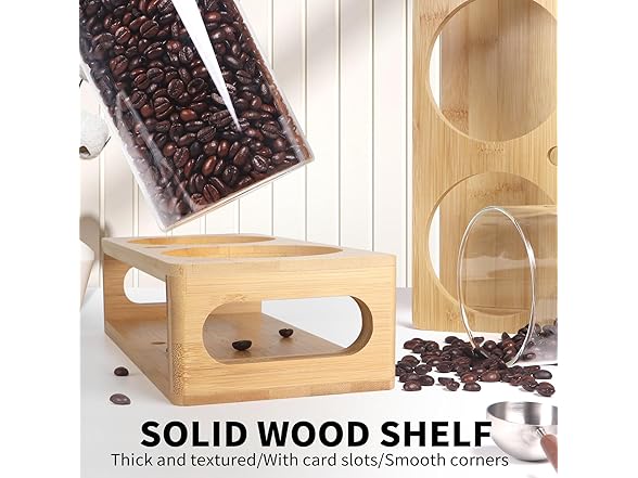 - Coffee tea sugar container set- The shelf is made of solid wood. The four corners have been polished. We have added wide holes on both sides which is designed after physical experience, suitable for your hand and allows you to move the jar kit easily. It can effectively organize the canisters and spoons,keep your things in order.