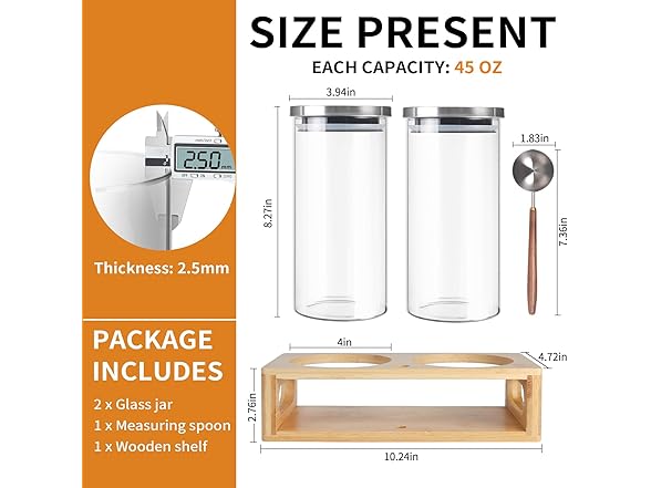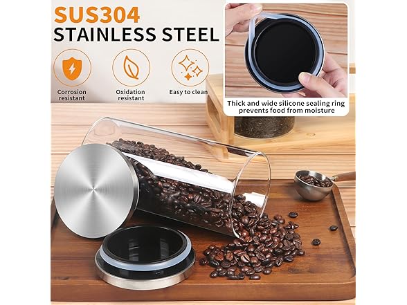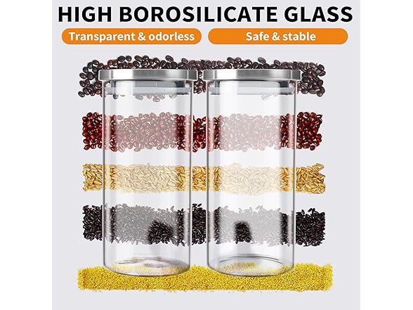 - Glass storage jars- This set of jars is made of high-quality borosilicate glass, clean and non-toxic for food storage. It can accommodate most general food, such as coffee beans, tea ,various nuts, pasta, flour, pet food etc. Transparent glass allows you to clearly monitor the contents inside and is easy to clean.