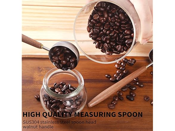 - Coffee container with scoop- The scoop head is made of SUS304 stainless steel, which can directly contact with food and is easy to clean. The handle is made of walnut, which is not easy to damage and crack. The shape fits the palm of the hand and feels light. The weight of a single spoon is about 30 g.