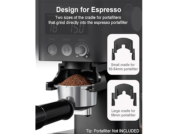 - ☕【Design For Espresso 】Comes with 2 size portafilter cradles, small for the 50-53mm portafilter and big for the 58mm portafilter. Grind the coffee beans directly into the portafilter using the cradle, which makes grind more convenient and helps you save time