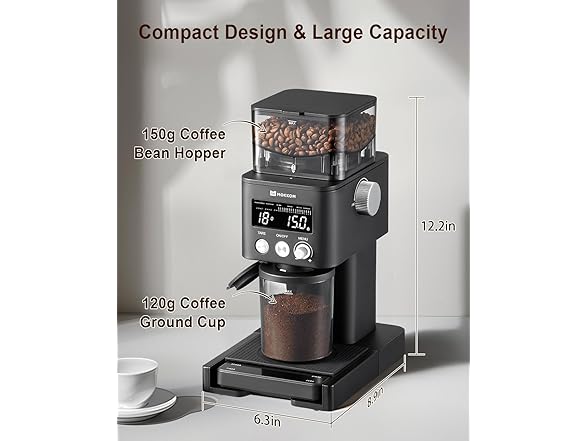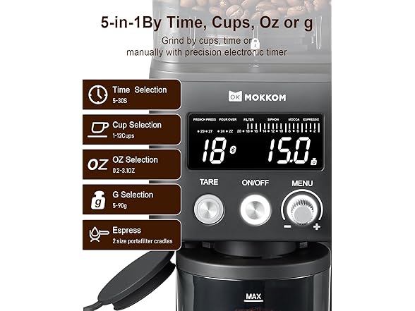 - ☕【4-in-1 By Time/Cups/OZ/g】Grind by cups, time, OZ, or g with a precision electronic instrument. Precision Electronic Timer allows you to adjust grind time up to 60 seconds in 0.1-second increments; The cup number can be selected from 1 to 12 cups; The OZ can be adjusted from 1 to 5.3oz; The g can be adjusted from 1 to 150g