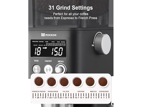 - ☕【31 Precise Grinding Settings】 Mokkom coffee grinder with 31 precise grind settings from the finest Espresso to the coarsest French Press, meets all your grinding needs