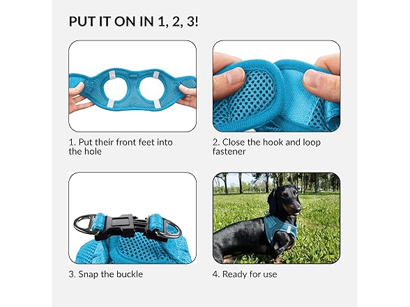 - EASY TO USE - The dog harness for small dogs has a step-in design which makes it easy to put on and take off in just a few steps. Simply put their front feet into the hole, close the hook, loop the fastener, and snap the buckle.