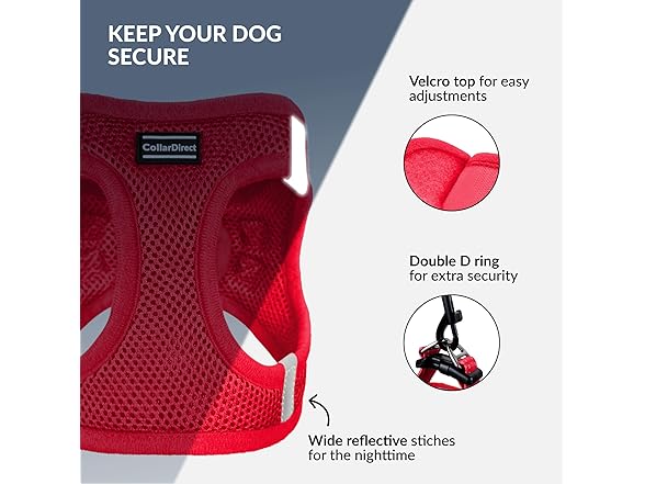 - DESIGNED WITH EXTRA SAFETY FEATURES - The wide reflective stitches on the dog walking harness are ideal for nighttime walks, as they make your dog more visible. Plus, the dog vest harness is equipped with extra safety features for your dog. The velcro combined with a buckle and double D-ring design prevents pulling and choking.