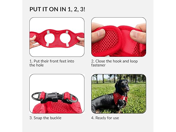 - EASY TO USE - The dog harness for small dogs has a step-in design which makes it easy to put on and take off in just a few steps. Simply put their front feet into the hole, close the hook, loop the fastener, and snap the buckle.