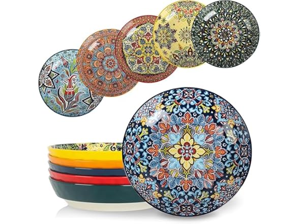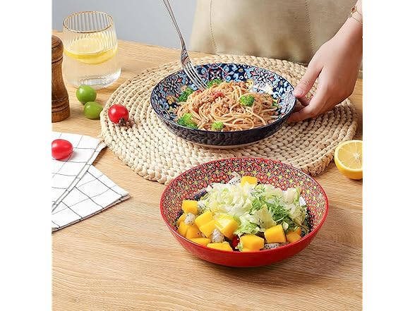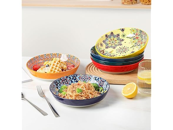 - 【VIBRANT COLORS & ELEGANT DESIGN】 Brighten your dining experience with these colorful ceramic pasta bowls. Featuring bold colors and decorative patterns, they turn everyday meals into special occasions. Whether hosting a family gathering, serving pasta, salad, or enjoying a cozy dinner, these bowls add a joyful touch to any meal.