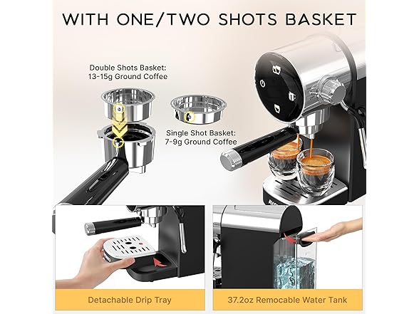 - Designed for ease-of-use and maintenance: With its simple, stylish design, this espresso machine is space-saving and easy to clean. Removable drip tray and water tank make refilling and cleaning a breeze.