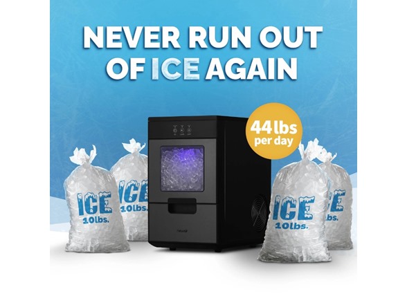 - Large capacity ice maker churns out up to 44 pounds of nugget ice daily.