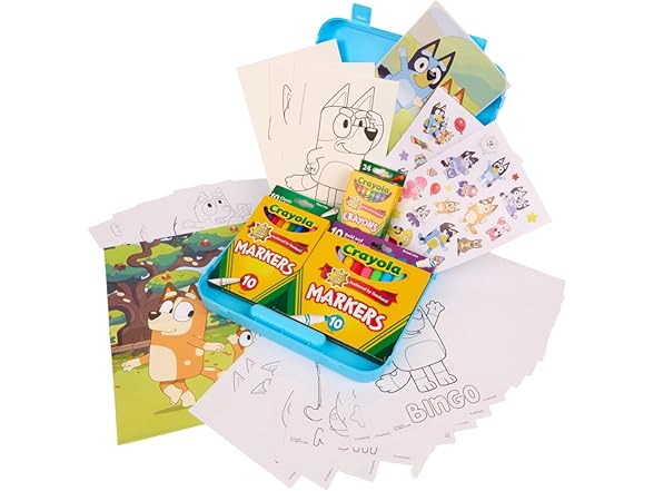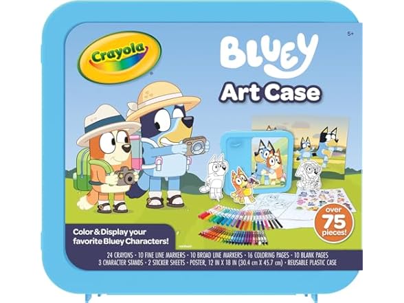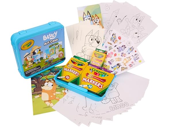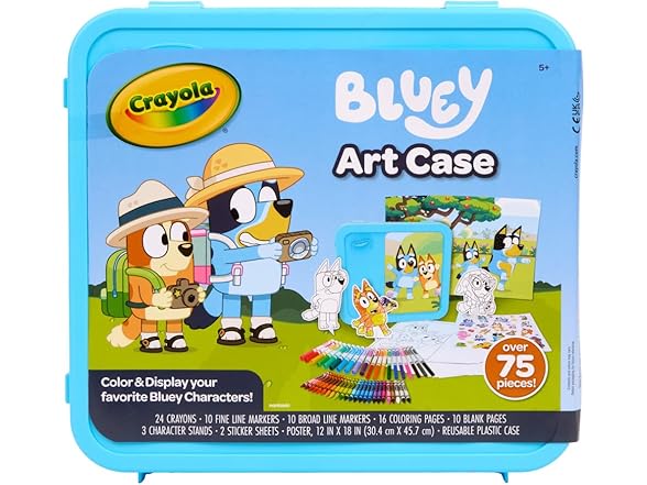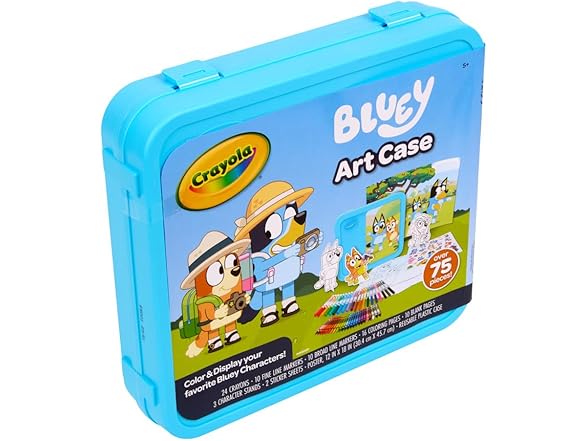 - BLUEY CREATE & COLOR ART CASE: This Bluey Art Set includes 24 Crayons, 10 Fine Line Markers, 10 Bold Broad Line Markers, 16 Line Art Pages, 10 Blank Pages, 3 Character Standees, 2 Sticker Sheets, and a Bluey Storage Case.