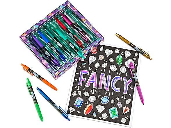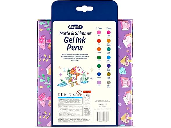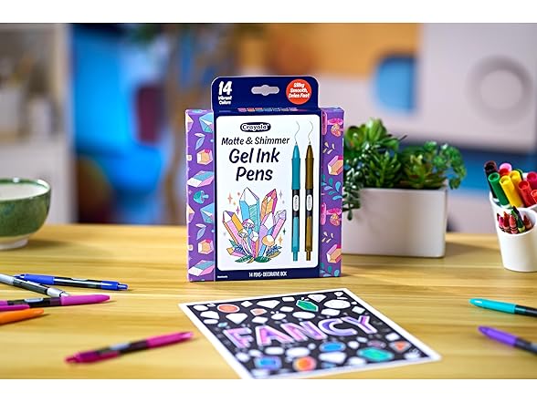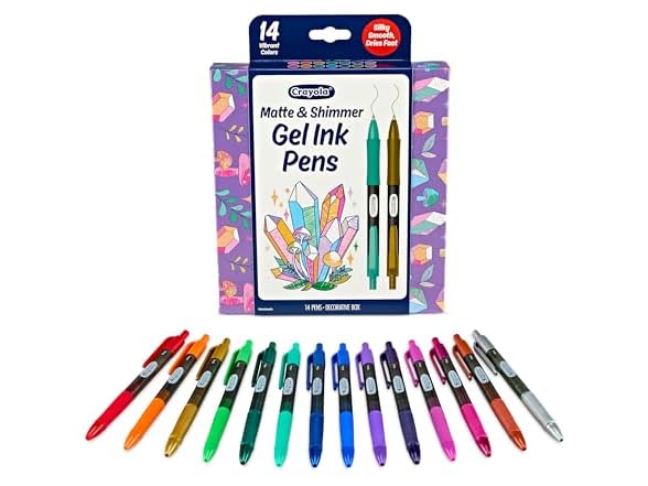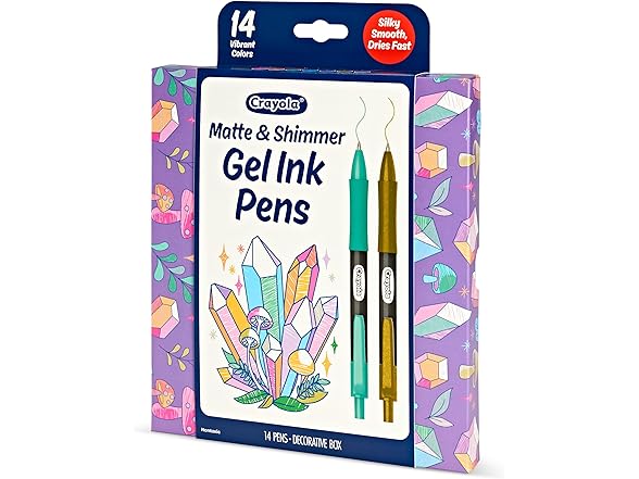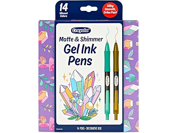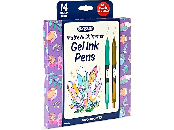 - CRAYOLA GEL INK MARKERS: Includes 14 Gel Ink Markers (7 Matte & 7 Shimmer) and 1 Decorative Box.