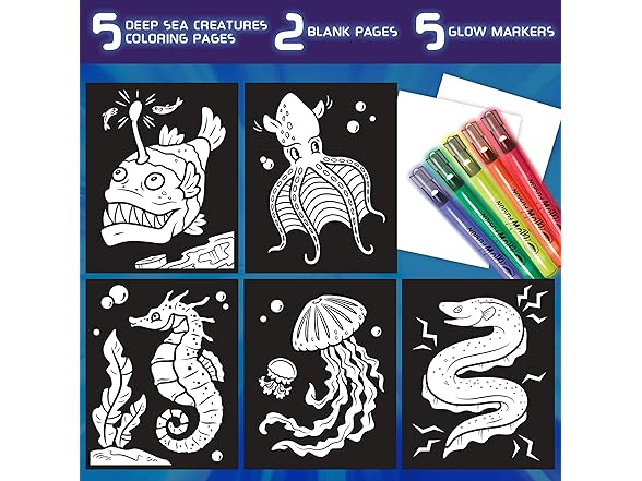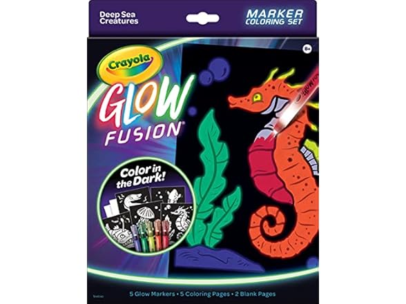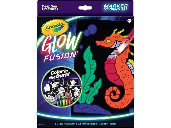 - GLOW FUSION MARKER COLORING SET: The set includes 5 Glow Markers (Red, Orange, Yellow, Green & Blue), 5 Deep Sea Creature Coloring Pages, and 2 Blank Pages.
