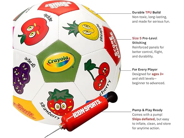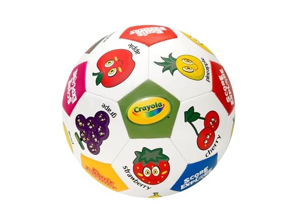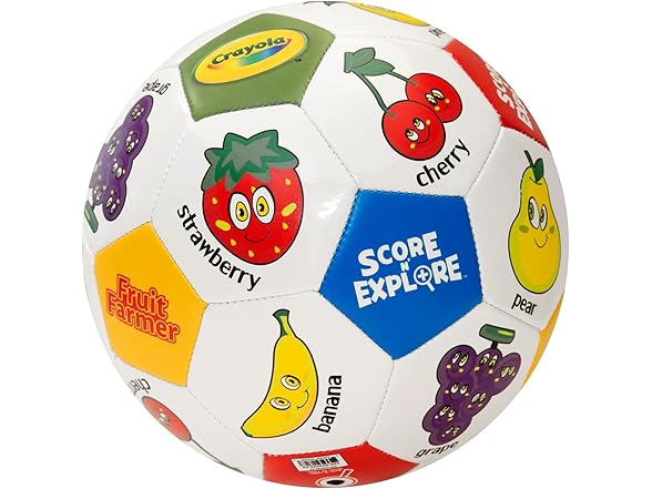 - Component Explanation | Durable Synthetic Panels – Made with sturdy synthetic panels and reinforced machine stitching, this ball offers durability and long-lasting shape. Featuring Crayola-inspired fruit patterns such as apples, bananas, strawberries, and oranges, it adds a bright and cheerful design to every match or practice