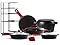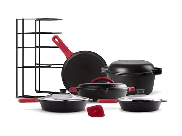 Cuisinel Cast Iron 17-Piece Preseasoned Cookware Set - 8"+10" Skillets + Lids + 5-Quart Dutch Oven + 12" Braiser with Cast Iron Lid + Round Griddle + 15" Organizer Rack + Pan Scraper + Silicone Handle