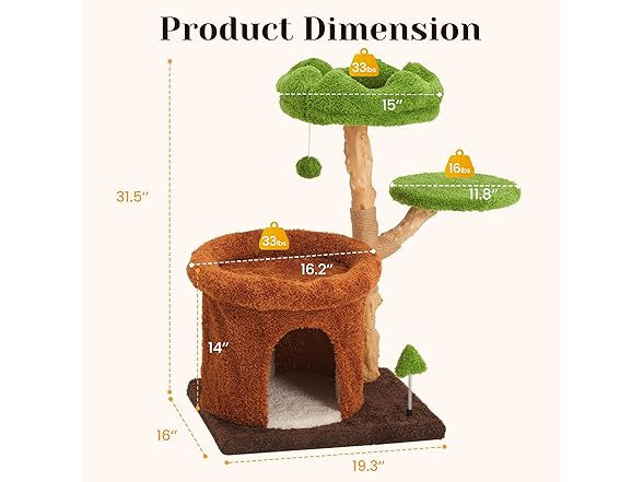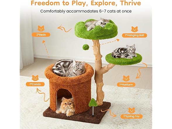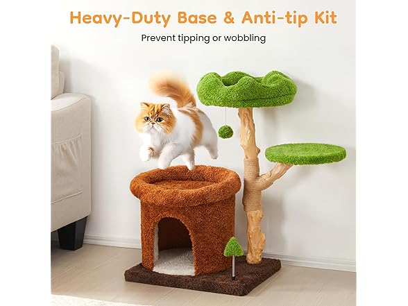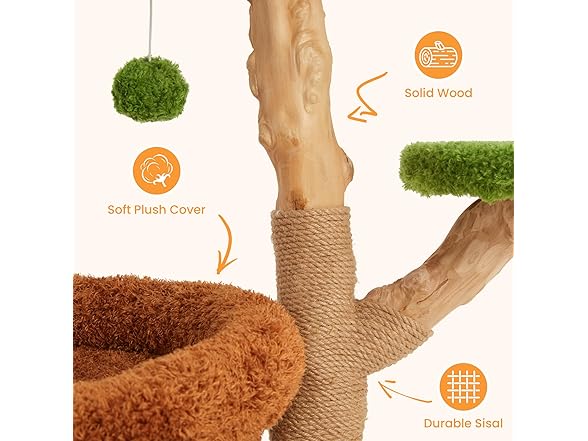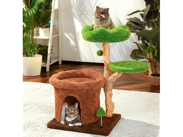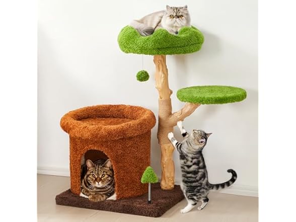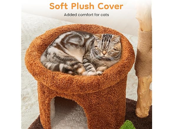 Fansafurn Cute Cat Tree with Scratching Posts, Bed & Condo, Multi-Level Cat Tower for Playful Cats and Multiple Cats, 32" Wooden Climbing Tower with Natural Wood & Soft Plush