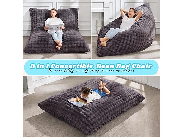 - 3 in 1 Convertible Bean Bag Chair: Big bean bag chair is versatility in adjusting to various shapes makes it a ideal fit for any room, whether it's for unwinding in the living room, creating a cozy reading nook in the bedroom, or setting up a snug study spot in a dorm. As a 3 in 1 product, bean bag bed for adults can be used as a traditional bean bag chair, lean it up against a wall like a bean bag sofa, or laid out as a bean bag floor cushion.