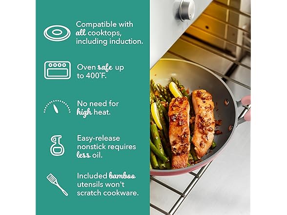 - OVEN SAFE – Oven safe cookware set for up to 400°F and dishwasher safe (handwash recommended). Plus, it’s compatible for all cooktops, including as induction cookware. Handles are crafted using stainless steel wrapped in silicone for comfort and safety.