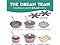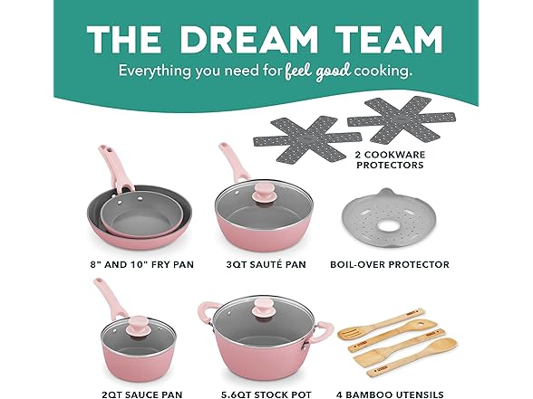 - HEALTHY CERAMIC POTS AND PANS SET - DASH Dream Green pans set is made of 100% recycled aluminum cookware bodies with ceramic nonstick coating. Includes 8”, 10” fry pans, 3Q saute pan, 2Q sauce pan, 5.6Q stock pot, boil over protector & 4 bamboo utensils.