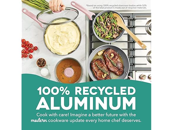 Upgrade your kitchen cookware set and help prevent waste with the 15-Piece Dash Dream Green Recycled Aluminum Cookware Set! This nonstick ceramic cookware set is constructed with 100% recycled aluminum bodies, and 52% of the total product is made out of recycled materials, which helps minimize waste. Set is compatible with all cooktops, including as induction cooktop cookware or cookware for glass top stove, and is oven safe up to 400°F. Pots and pans feature an aluminum construction that maximizes heat distribution and retention, as well as our CleanCoating Safe pure ceramic coating. Stainless steel handles are wrapped in silicone and designed with comfort in mind, and the set includes four bamboo utensils that are easy to use with the fry pan set. These dishwasher safe pots and pans are lightweight, durable, easy to clean and includes everything your kitchen needs! Set includes 8” and 10” fry pans, 3Q saute pan, 2Q sauce pan, 5.6Q stock pot, boil over protector & 4 bamboo utensils.
