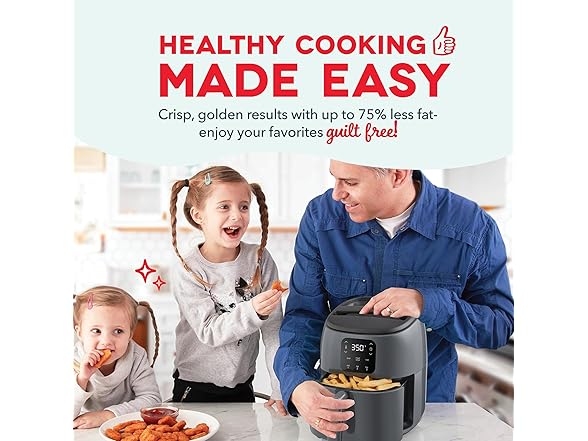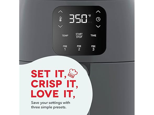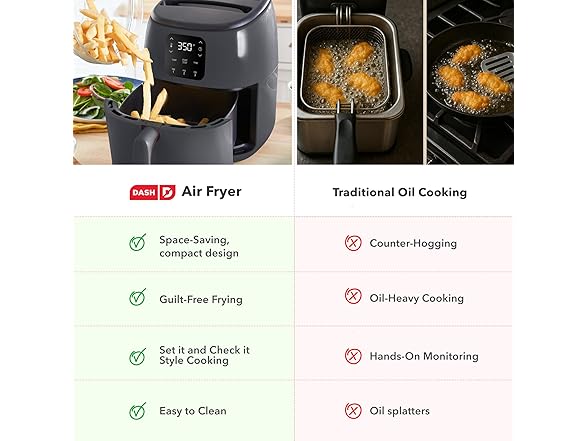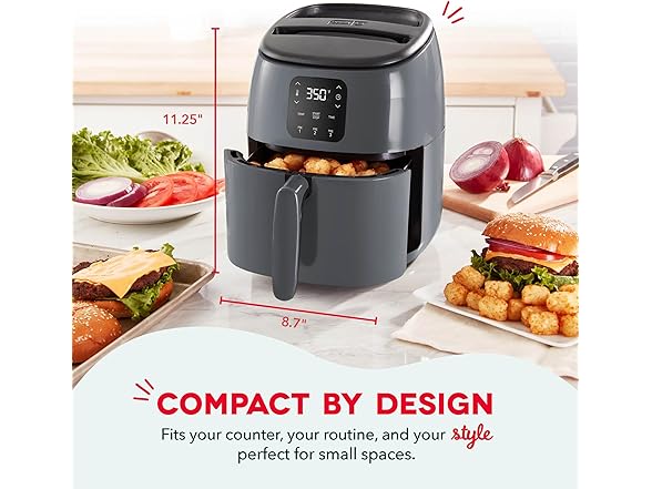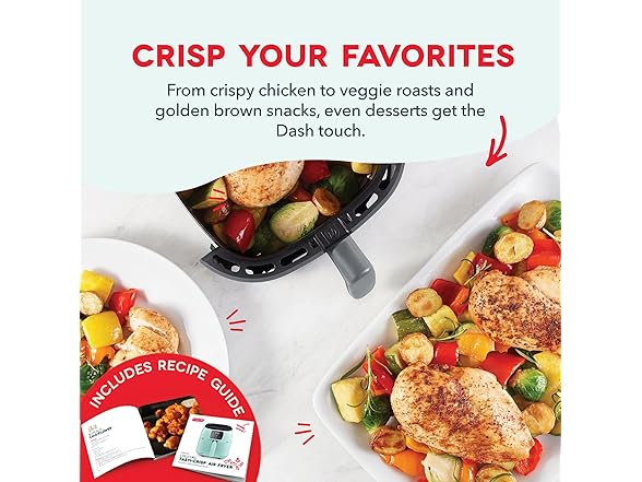 Meet your new kitchen MVP—the Dash Tasti-Crisp™️ Digital Air Fryer. Designed with a space-saving design, this compact and easy-to-clean, multi-purpose cooking device is perfect for single cooks, couples, or anyone looking to whip up healthier, low-oil meals without fuss. The Removable Crisper Basket makes cleanup a breeze. Whether you’re craving crispy veggies or golden chicken wings, the rapid air circulation technology cooks food evenly and delivers satisfying crunch with less oil and less mess. Get ready for delicious results at the push of a button with the Digital Display Screen. The adjustable temperature control and timer let you dial in your cooking for perfection every time, so you can avoid guesswork and enjoy consistent results. The quick heat-up device gets meals started in no time, making it easy to go from prep to plate in a flash. And with the auto shut-off feature, you can cook with confidence, knowing your Digital Air Fryer turns itself off when the timer runs out—no more overcooked snacks or rushed mealtimes. From appetizers to desserts, this versatile air fryer is a true multi-purpose cooking device, ready to tackle everything from crispy potatoes to cheesy pizza. Its compact footprint fits snugly on any countertop, making it ideal for maximizing your kitchen space. With the Dash Digital Air Fryer, eating well and cooking at home has never been so easy—or so much fun. We believe that taking small steps every day to live a healthier life can have a big impact. And that the best path to wellness is eating whole, natural foods. At Dash, we make products that make it easier for you to prepare and eat real food at home so that you can feel your best.