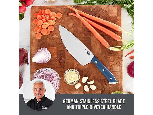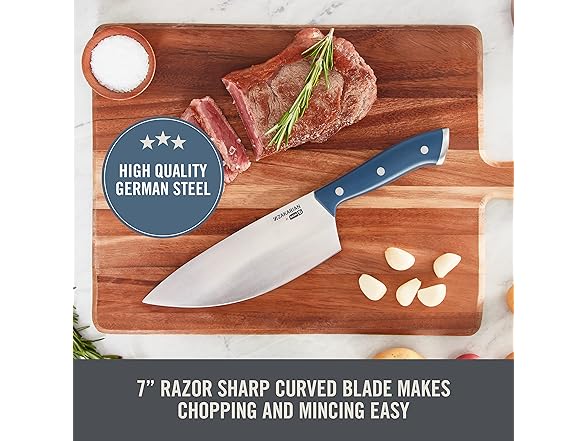 - HIGH QUALITY GERMAN STEEL: Knives feature full tang blades made from German steel for superior durability and cutting. Corrosion resistant steel is stronger and more durable than other materials, resisting chipping and breaking, and maintains sharpness over time.