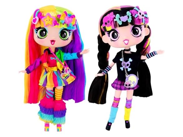 - POSEABLE AND TRENDY: This children and tween gift set introduces gothic Luna and Decora Art Doll with rainbow-colored, super-soft nylon hair and easy-to-dress clothing, including a chic one-shouldered dress, and stickers for their hair and outfit.