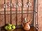 An excellent addition to any kitchen, this coffee brown baker's rack not only puts things in a good location, but it also provides storage for those hard to place items. The rectangular metal frame provides a rigid construction while incorporating lovely decorative scrolls on either side. There is a bottom shelf that sits just 6" off the floor measuring 15" deep, 34" wide, and 16" tall as well as a tabletop working surface that is 15" tall, 15.5" deep and 34" wide. Both of which are finished with a rich mahogany stain. A wonderful 6 bottle wine rack directly beneath it also enhances the main working surface. The upper two 8" deep shelves have inlaid clear glass to provide a beautiful display area. The top shelf also hosts a rack for wine glasses on the bottom side.
