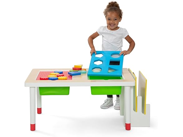 - 4 ACTIVITY BOARDS: 4 unique interchangeable boards provide multiple ways to play – choose from shape sorting, building blocks, gears or musical instruments| Table includes colorful shape sorting blocks and drum sticks