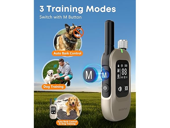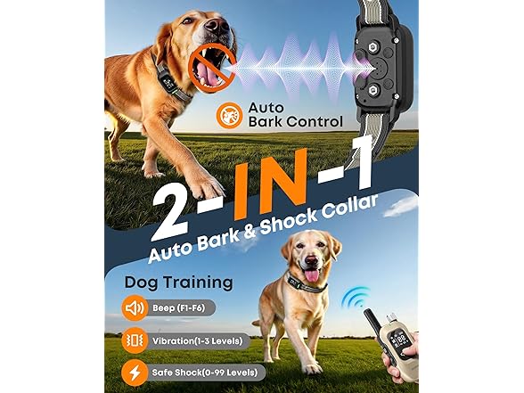 - 2-in-1 Advance Design - Train your dog hands-free! This upgraded e collar combines dog training collar with remote and anti bark collars in one set. Switch between remote mode for command-based training and automatic mode for barking control. The AI chip precisely distinguishes barking from ambient noise, ensuring only your dog’s bark triggers correction