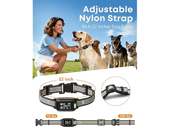 - Adjustable Fit For All Breeds - The e collar for dogs training have comfortable and durable nylon strap fits necks 6–22 inches, perfect for small, medium, and large dogs (10–100 lbs). The dog trainer collar bright LED screen offers clear visibility even in low light, it has a memory function without resetting it