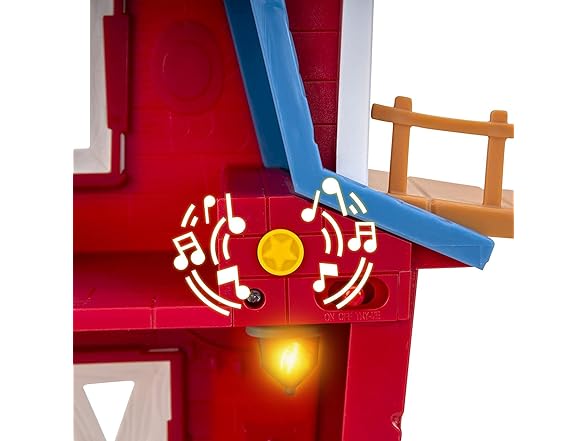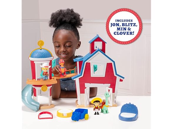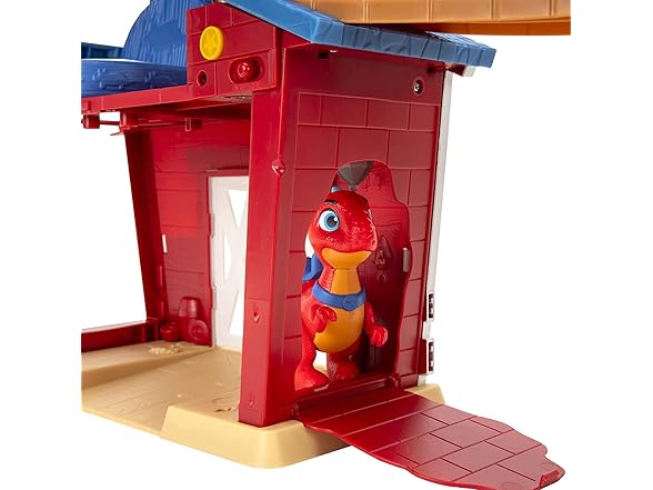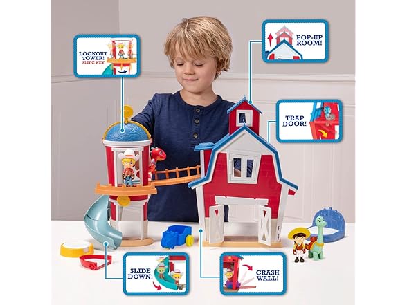Welcome to the Dino Ranch Clubhouse! This large, modular playset comes with lights and sounds. Join Jon and Min at the Clubhouse, the place where the Dino Ranchers come together for daily adventures. Featuring a bright red barn, the Dino Ranch Playset comes with a 3” Jon figure and a 3” Min figure alongside their dino best friends, Blitz the velociraptor and Clover the brontosaurus. With Jon, Min, Blitz, and Clover, head inside the Clubhouse to discover its many exciting features! For example, the rooftop extends. Place Jon or Min inside and push them down to find the trap door on the floor inside the barn! You can even knock down the crash wall from the inside. Activate sounds & phrases when you press the star button to light the oil lamp! Place Jon and Min on the balcony and move them side to side to keep watch over all of Dino Ranch. When the day is done, there are dino beds where Blitz and Clover can sleep. Create your own ultimate playground with all the Dino Ranch figures, vehicles, playsets, plush, blinds, and more from the hit children’s TV show!
