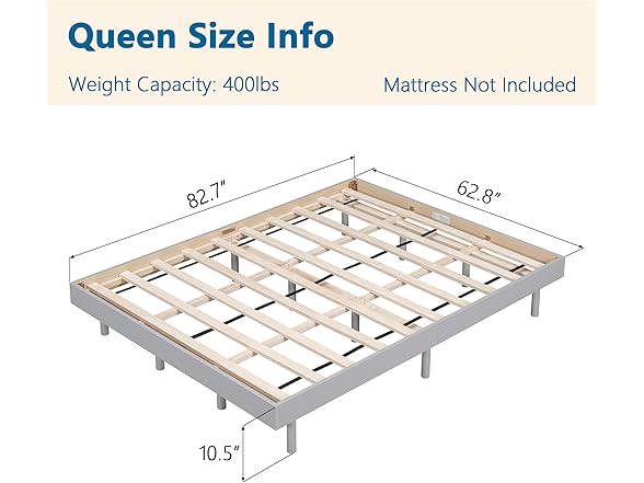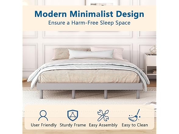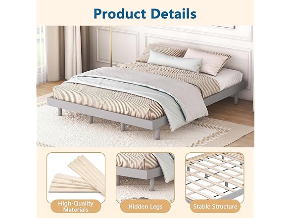 - Convenient Low Profile: This floating frame features a contemporary low-profile platform design that adds a touch of elegance and sophistication to any bedroom decor. The low-profile platform bed design enhances your convenience and ease when getting in and out of bed. It's designed to improve your sleeping experience while optimizing your living space.