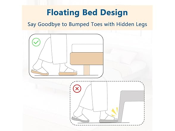 - Floating Illusion Design: Experience the illusion of floating with this bed frame design. With concealed bed legs, the bed frame is featured a unique floating appearance, giving your bedroom a sleek and contemporary look. Say goodbye to stubbed toes and uncomfortable collisions with bed legs.