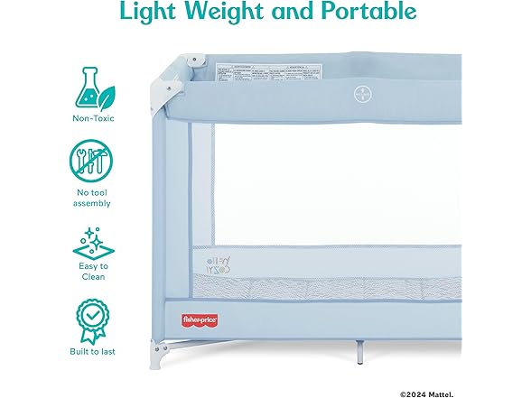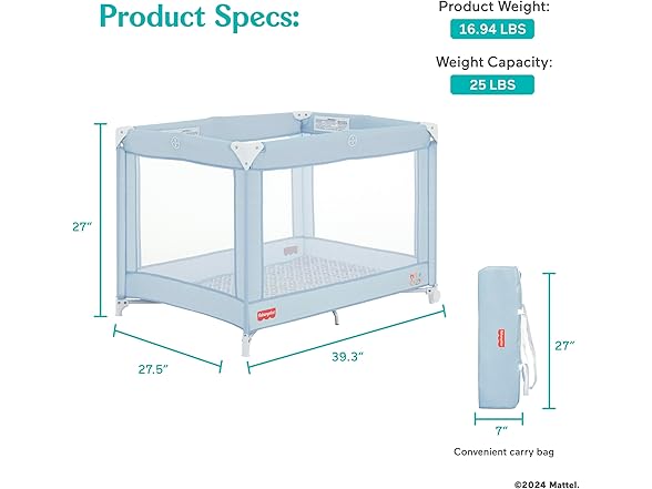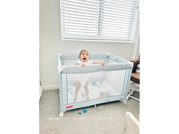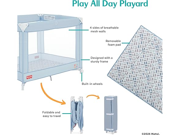 The Fisher-Price Play All Day Baby Playard is designed to make life easier for parents while keeping little ones safe, comfortable, and happy. Whether you’re at home, traveling, or visiting family, this portable playard sets up in seconds with a simple one-hand fold. Lightweight and compact, it even includes a convenient carry bag so you can take it wherever your adventures lead. With four breathable mesh sides, your baby stays cool and visible at all times, giving you peace of mind and ensuring airflow during naps and play. The sturdy frame and ASTM safety testing mean you can trust this playard to provide a secure environment, while the soft high-density foam mattress pad delivers cozy comfort for both rest and playtime. Parents love how practical it is — there’s no tool assembly required, the surfaces are wipeable and easy to clean, and the built-in wheels let you move it effortlessly from room to room. Designed for babies and toddlers aged 6–36 months (up to 30 lbs.), this playard grows with your child through every stage of early development. Available in stylish finishes like Moon Mist and Rainbow Black, the Fisher-Price Play All Day Playard isn’t just functional — it’s a modern addition to your home that makes playtime and naptime stress-free, safe, and fun.