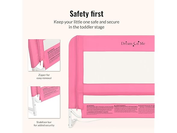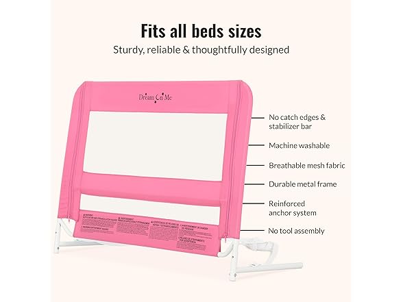 Moving from a crib to a “big kid bed” is an exciting milestone—but it can also be a little scary for both toddlers and parents. The Dream On Me Mesh Security Bed Rail helps make the transition safe, comfortable, and stress-free. Specially designed to fit adult twin-size beds, this rail provides dependable nighttime protection for your toddler. The sturdy steel frame offers stability, while the breathable mesh fabric keeps your child cool and cozy, with visibility that lets parents easily check in at a glance. Safety is built into every detail. With its reinforced anchor system, including a stabilizer bar and anchoring strap, the rail stays securely in place, preventing dangerous slips or gaps. Parents can sleep soundly knowing their little one is protected through the night. Installation is quick and simple. Thanks to the tool-free design, you can set up or remove the rail in minutes—no special hardware or complicated steps required. Its lightweight, foldable build makes it easy to store when not in use or pack along when traveling, so your child enjoys safe sleep anywhere. Whether at home, visiting family, or on vacation, the Dream On Me Mesh Security Bed Rail provides peace of mind for parents and security for toddlers ready to take that big step into their own bed.
